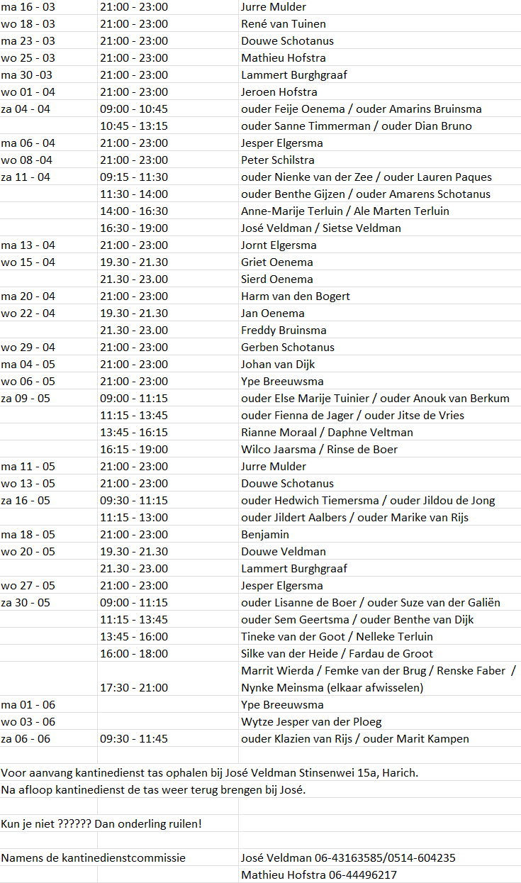 Ook achter de schermen wordt er hard gewerkt. José Veldman en Mattieu Hofstra hebben weer een duidelijk en overzichtelijk kantinedienstschema gemaakt. Dit is te vinden op de website, in de mededelingenapp en in Harich Nijs.