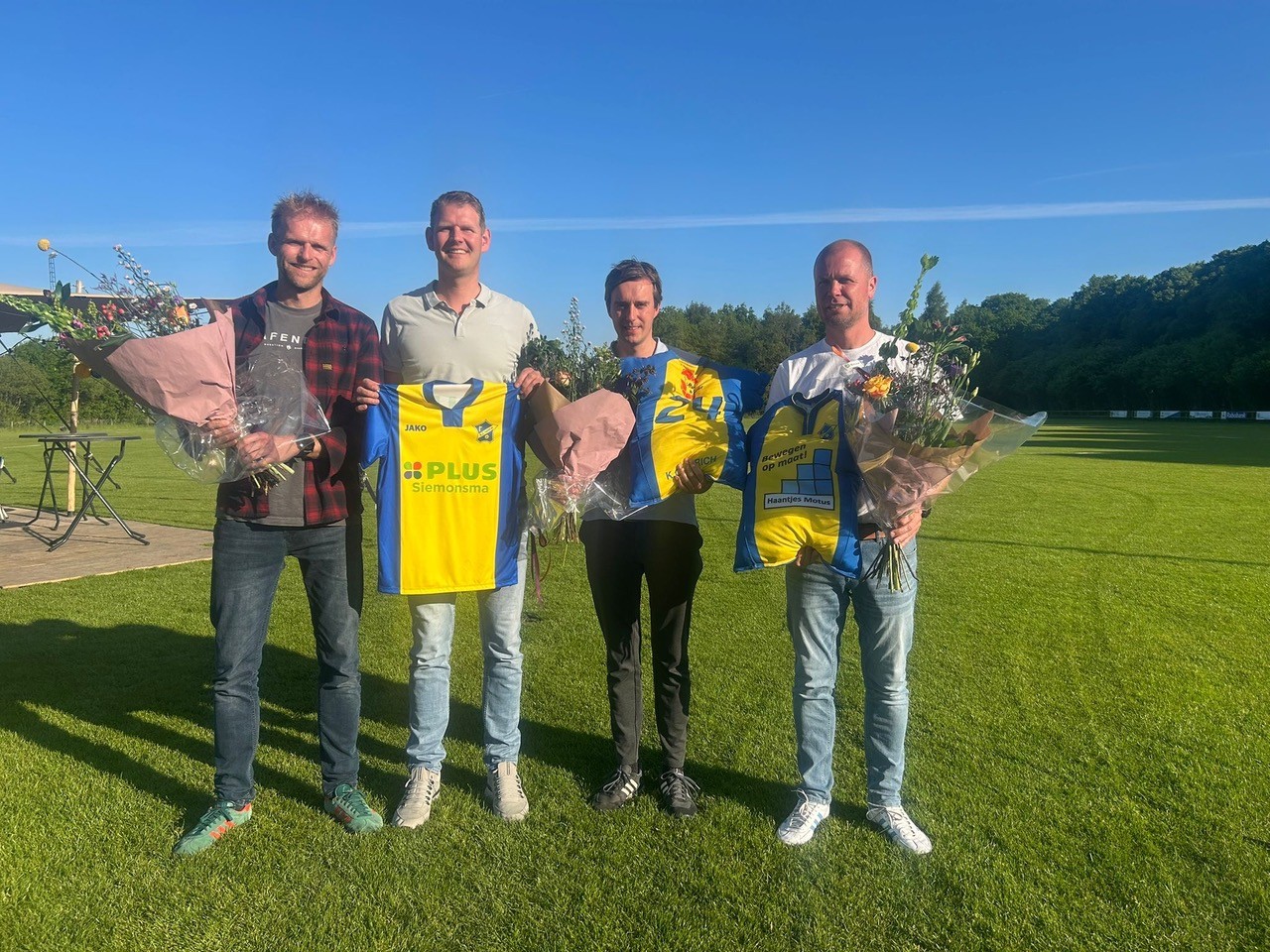 Op de foto ziet u namens de sponsorcommissie Willem van der Pol en de sponsoren Freddy Haantjes van Haantjes Motus, Ayelt van Zuiden van ’t Lear en Mear en Arend Siemonsma van PLUS Siemonsma.