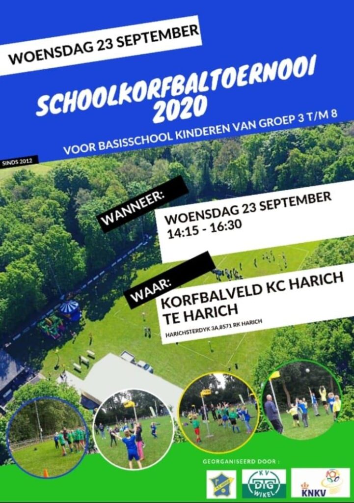 Woensdag 23 september organiseerden KC Harich en KV DTG gezamenlijk voor de 8ste keer het schoolkorfbaltoernooi. Op het korfbalveld van Harich speelden, met de corona regels in acht genomen, ruim 170 kinderen hun wedstrijden met veel enthousiasme. Een recordopkomst! Verdeeld over 28 teams, van 5 verschillende scholen uit Balk, Oudega, Sloten en Woudsend.