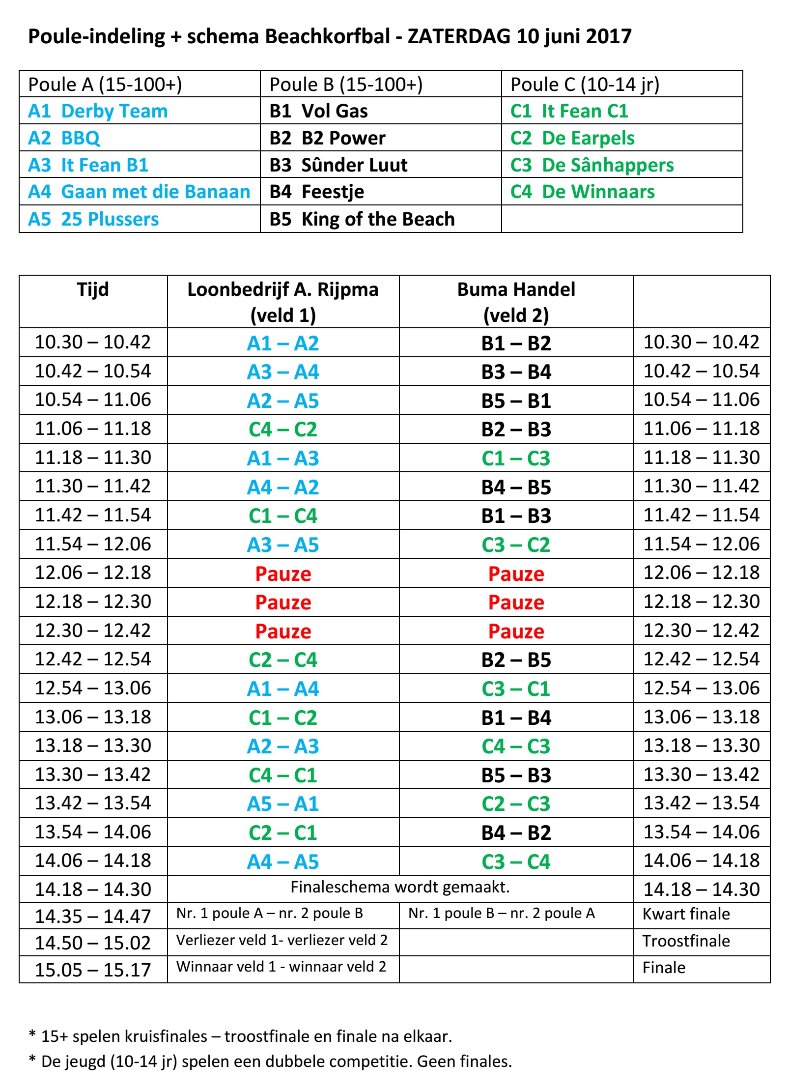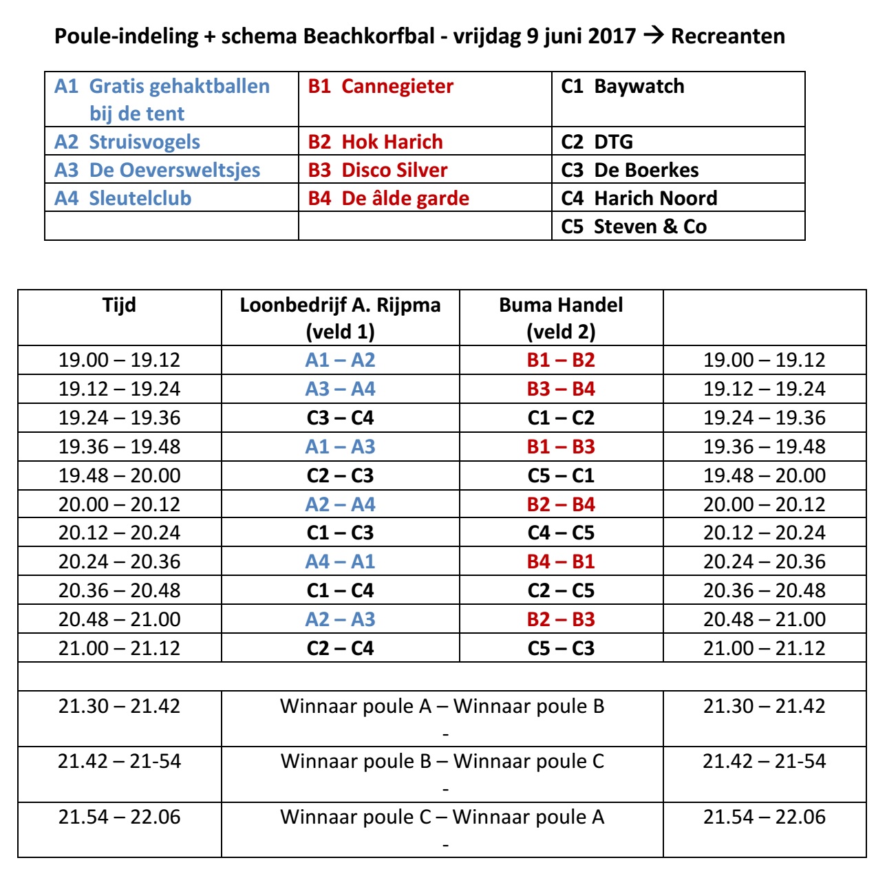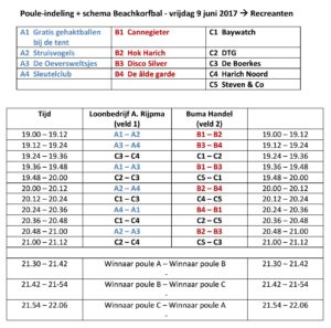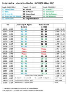 Beachkorfbal pouleindeling en wedstrijdschema.
